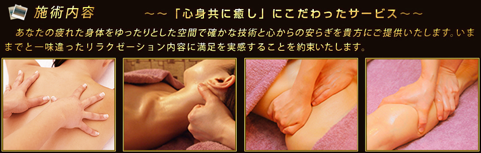 日常の疲れを、ゆったりと心地よく癒して 頂けるような施術を心がけています。お客様の大切なお時間を、至極のリラックスタイムにスタッフ全員笑顔でお待ちしていますので、お気軽にご来店ください。